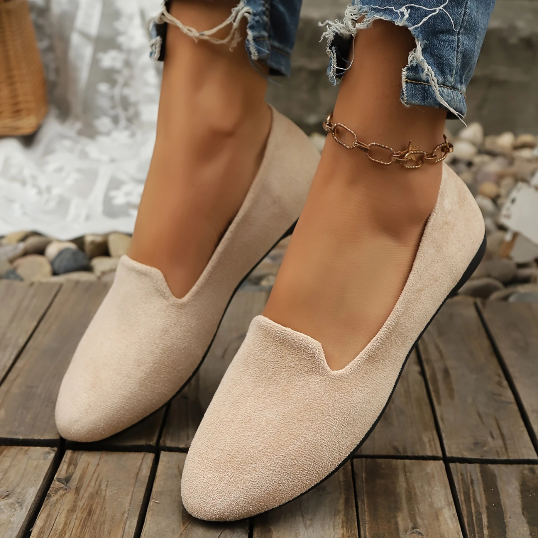 Con puntera redondeada y acabado aterciopelado, estos zapatos estilo bailarina aportan un aire delicado y contemporáneo, perfecto para quienes valoran la elegancia en el día a día.